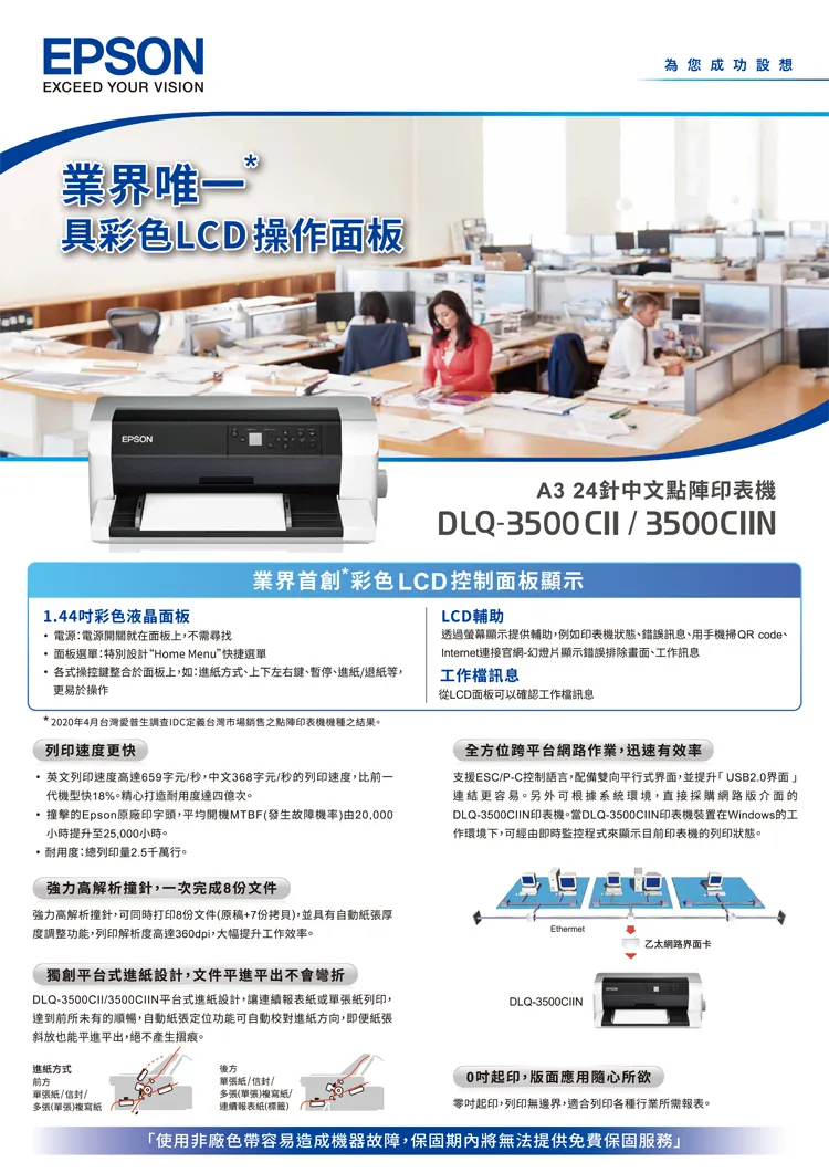 | 商品規格 | - 彩色LCD控制面板操作:列印軟體功能提升,透過螢幕顯示提供輔助 (可客製化支援- only forDLQ-3500CIIN網路版)