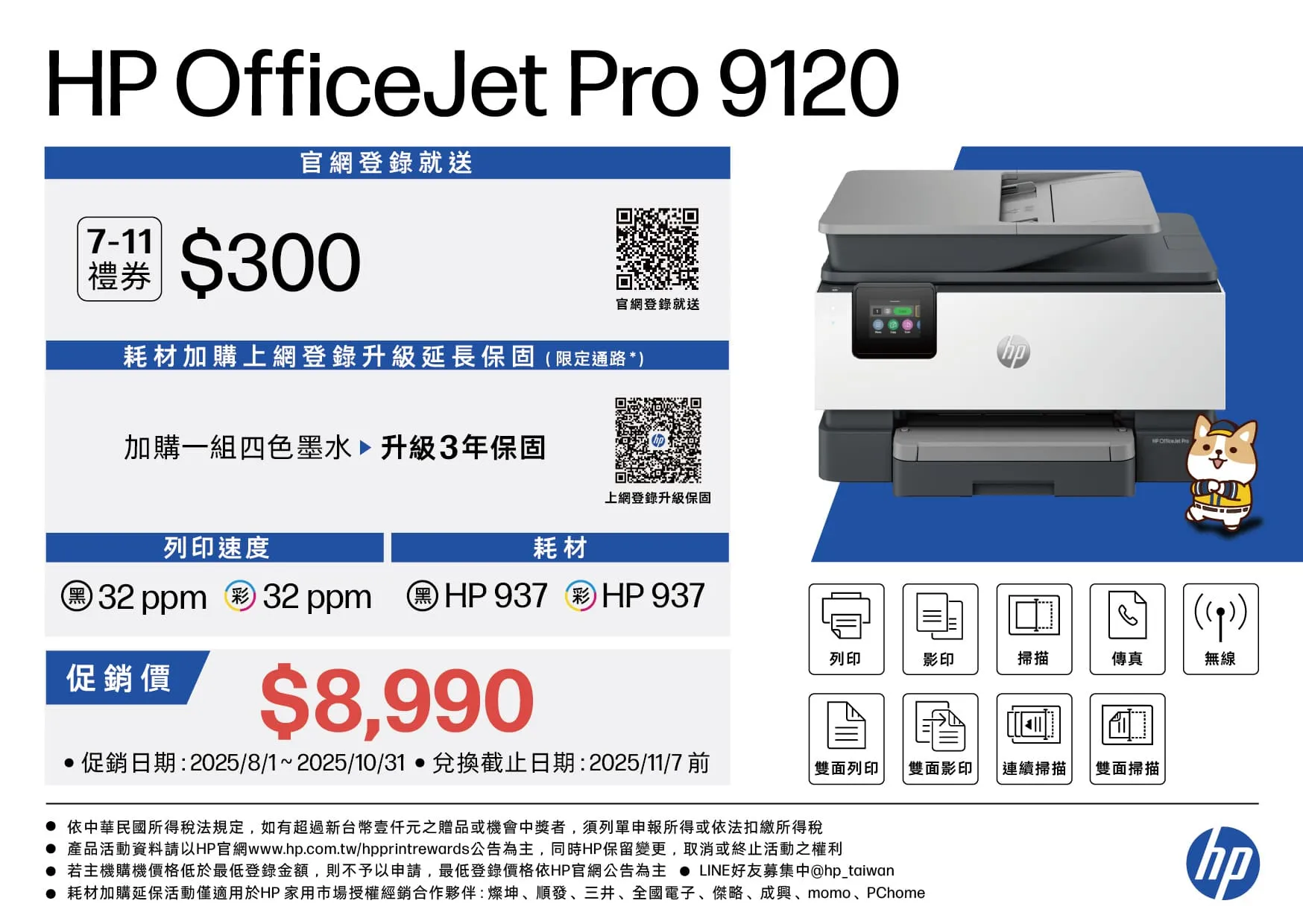| 墨水(碳粉)型號 | HP 937系列 原廠墨水匣 |