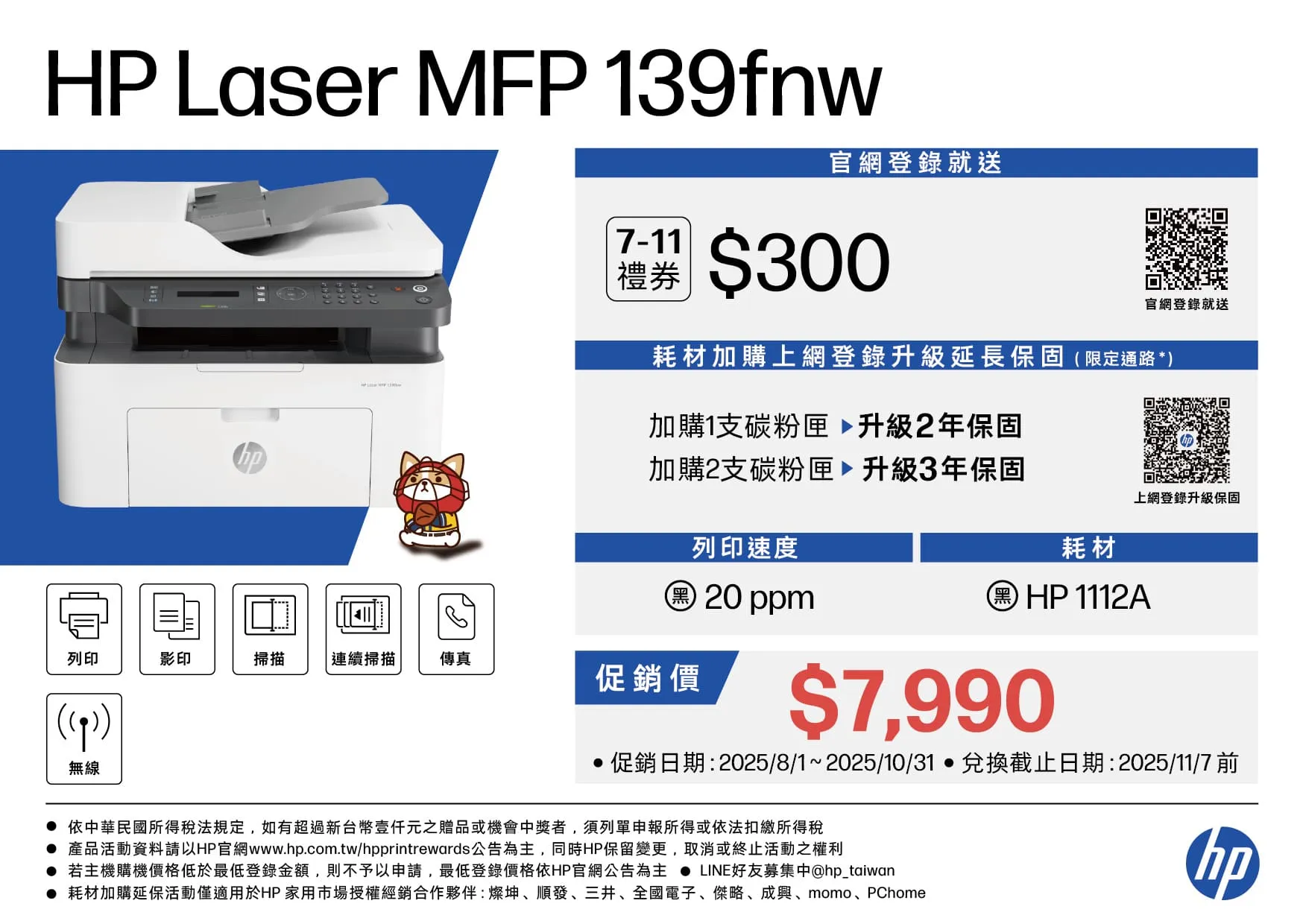 | 商品名稱 | HP Laser MFP 139fnw 黑白雷射傳真多功事務機 (A0NU1A) |